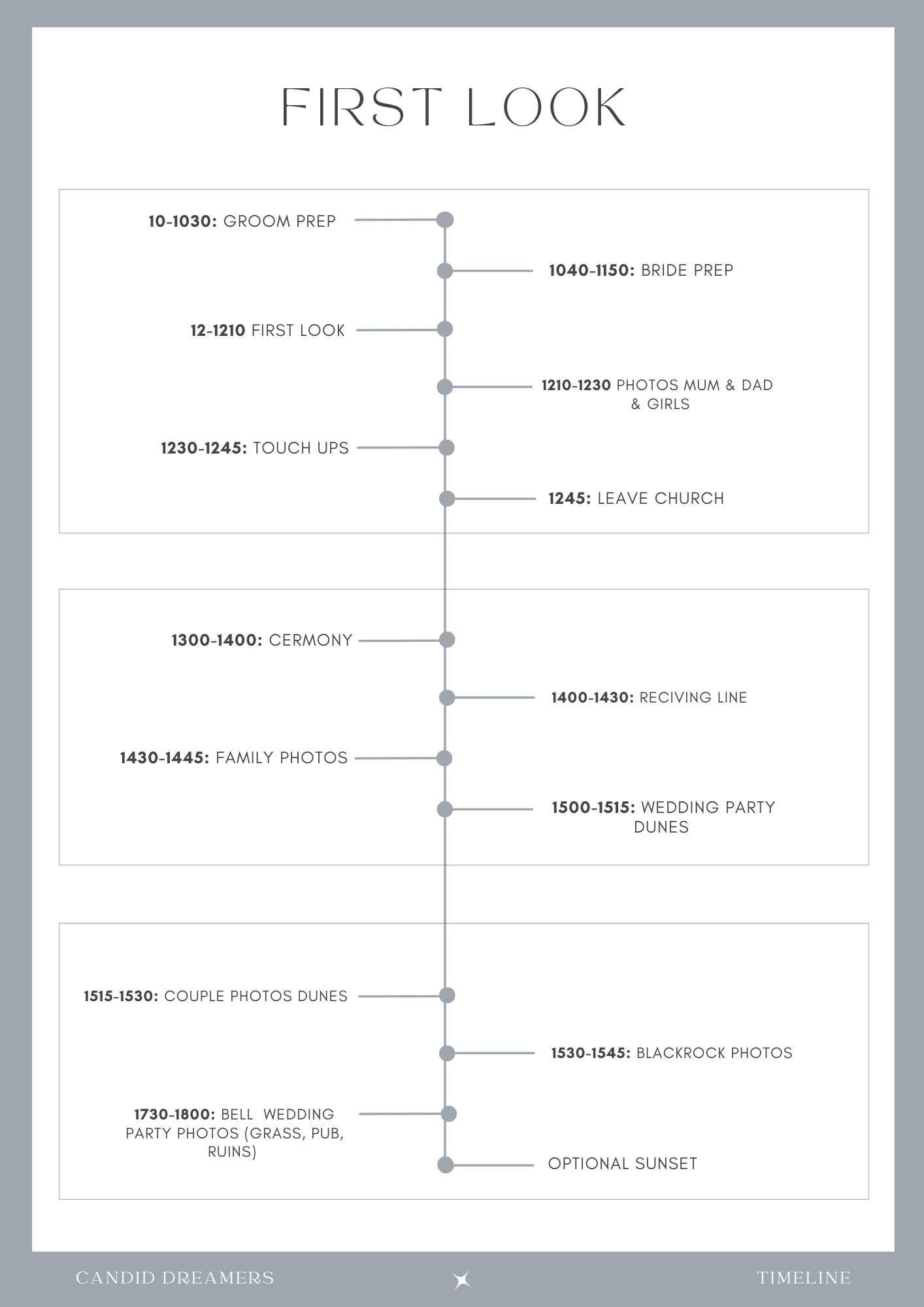 I like to design timelines tailored specifically to your ceremony time, as this serves as the anchor for the day’s schedule. Starting with the ceremony, I work backward to determine the best time for me to arrive and begin capturing the pre-ceremony moments, such as your getting-ready preparations and any special details you'd like included.