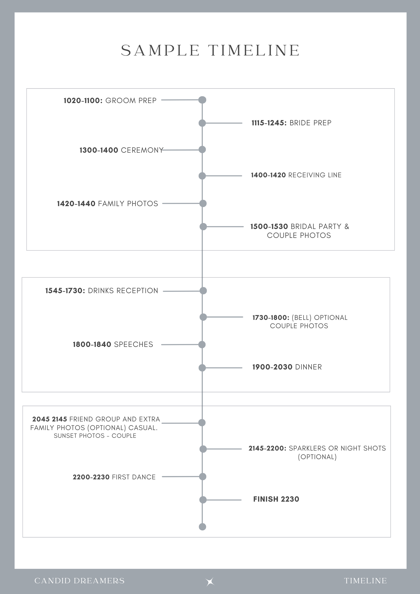 In this short blog post, I will go over some typical timelines to give you guidance on how to manage your Wedding Day from my perspective.